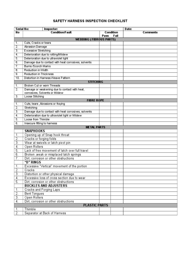 By trevor o'connell | last updated: Safetech ireland harness inspection safetech safety professionals offer a thorough examination service for working at height safety harnesses, lanyards and associated equipment. A safety harness, or construction harness, is a form of personal protective equipment designed to protect a person from injury while working at below is a list of the main items on each harness you should check during inspection before each use. Sample equipment checklist 8+ free documents download in word, pdf. Finally, whether during an inspection or your regular maintenance, if you find a problem or even a suspected problem, do not ignore it!