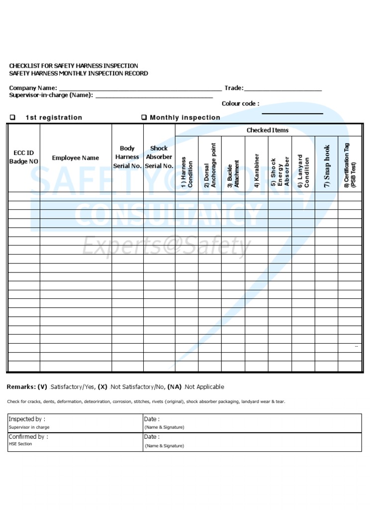 Documents similar to checklist for safety harness inspection. If you are in the business of working at heights and use harnesses and lanyards, then you may want to consider implementing a harness and lanyard inspection schedule into your safety program. A safety harness inspection should be personally conducted before each use. A copy of the inspection record/log is. Fall protection site safety inspection report form.